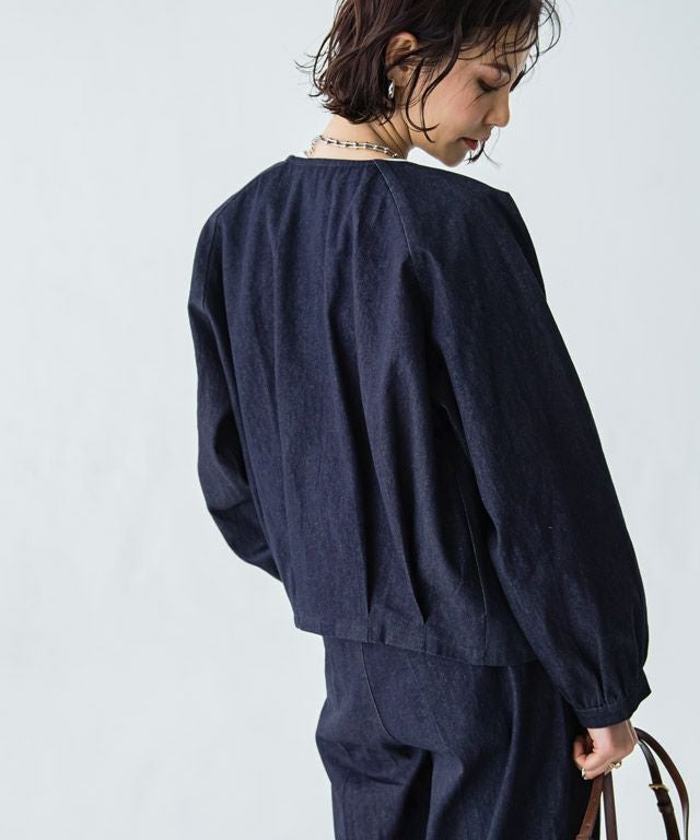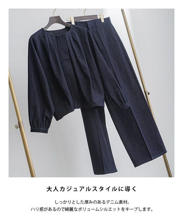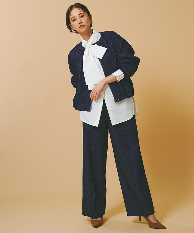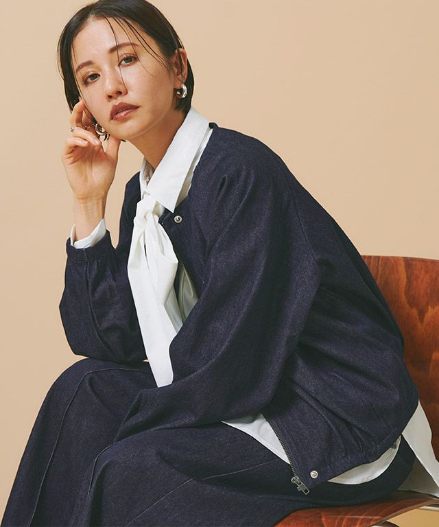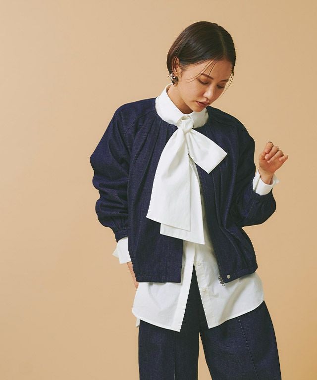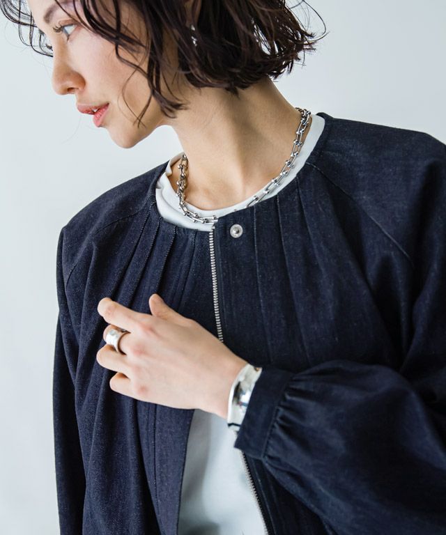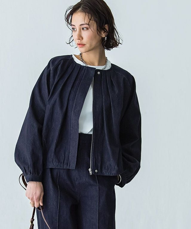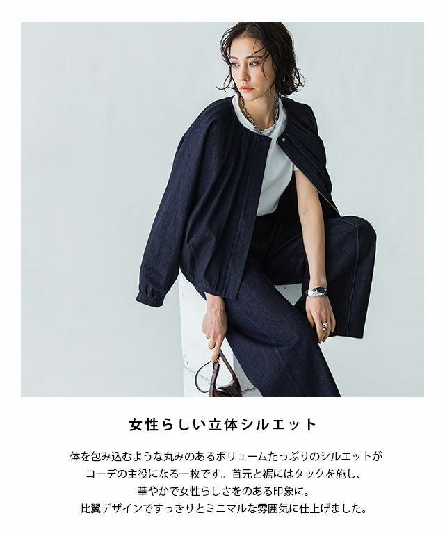 女性らしい立体シルエット"[RASW]デニムタックボリュームブルゾン"しっかりとした厚みのあるデニム素材。ハリ感があるので綺麗なボリュームシルエットをキープします。