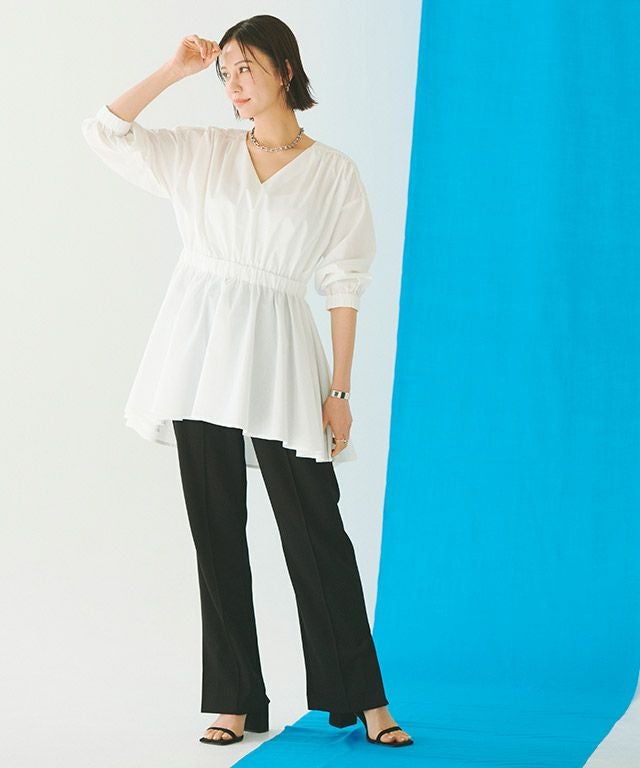さらっとした表面感が特徴の綿混素材。肌触りも良く、着心地の良い素材感です。柔らかさと程よいハリ感を兼ね備え、綺麗なシルエットをキープします。