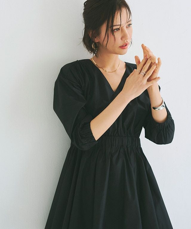 J 着丈はお尻がすっぽり隠れる丈感でした。袖丈は8分袖です。身幅は程よいゆとりがありました。ややハリ感のある素材で、シルエットがきれいです。ウエストはゴム仕様なので細見えします。