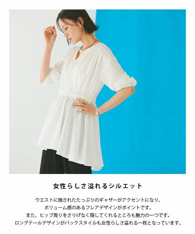 ウエストに施されたたっぷりのギャザーがアクセントになり、ボリューム感のあるフレアデザインがポイントです。また、ヒップ周りをさりげなく隠してくれるところも魅力の一つです。ロングテールデザインがバックスタイルも女性らしさ溢れる一枚となっています。