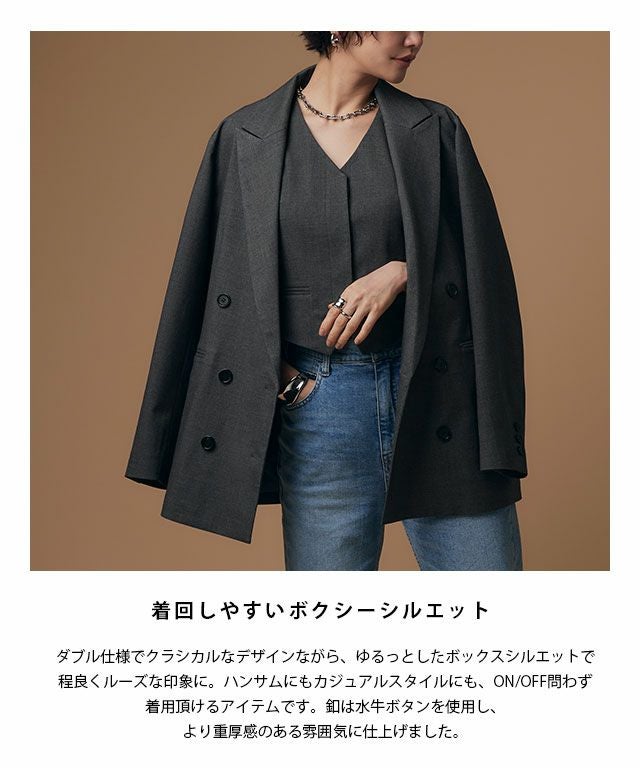 ダブル仕様でクラシカルなデザインながら、ゆるっとしたボックスシルエットで程良くルーズな印象に。ハンサムにもカジュアルスタイルにも、ON/OFF問わず着用頂けるアイテムです。釦は水牛ボタンを使用し、より重厚感のある雰囲気に仕上げました。