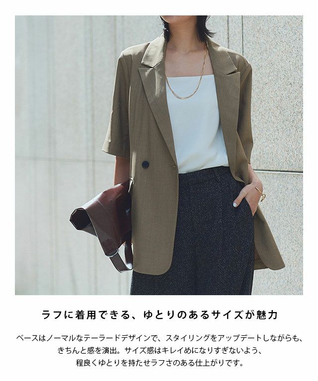 ベースはノーマルなテーラードデザインで、スタイリングをアップデートしながらも、きちんと感を演出。サイズ感はキレイめになりすぎないよう、程良くゆとりを持たせラフさのある仕上がりです。