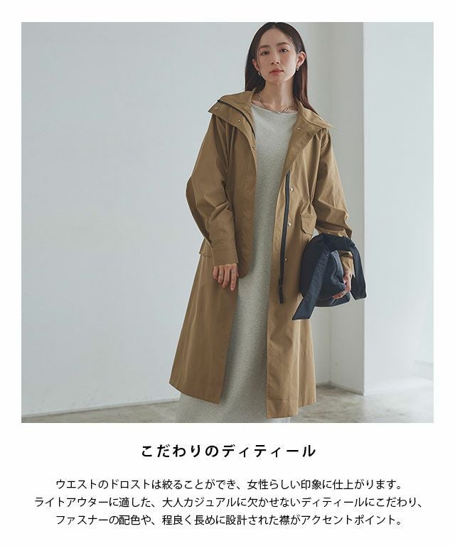 ウエストのドロストは絞ることができ、女性らしい印象に仕上がります。ライトアウターに適した、大人カジュアルに欠かせないディティールにこだわり、ファスナーの配色や、程良く長めに設計された襟がアクセントポイント。