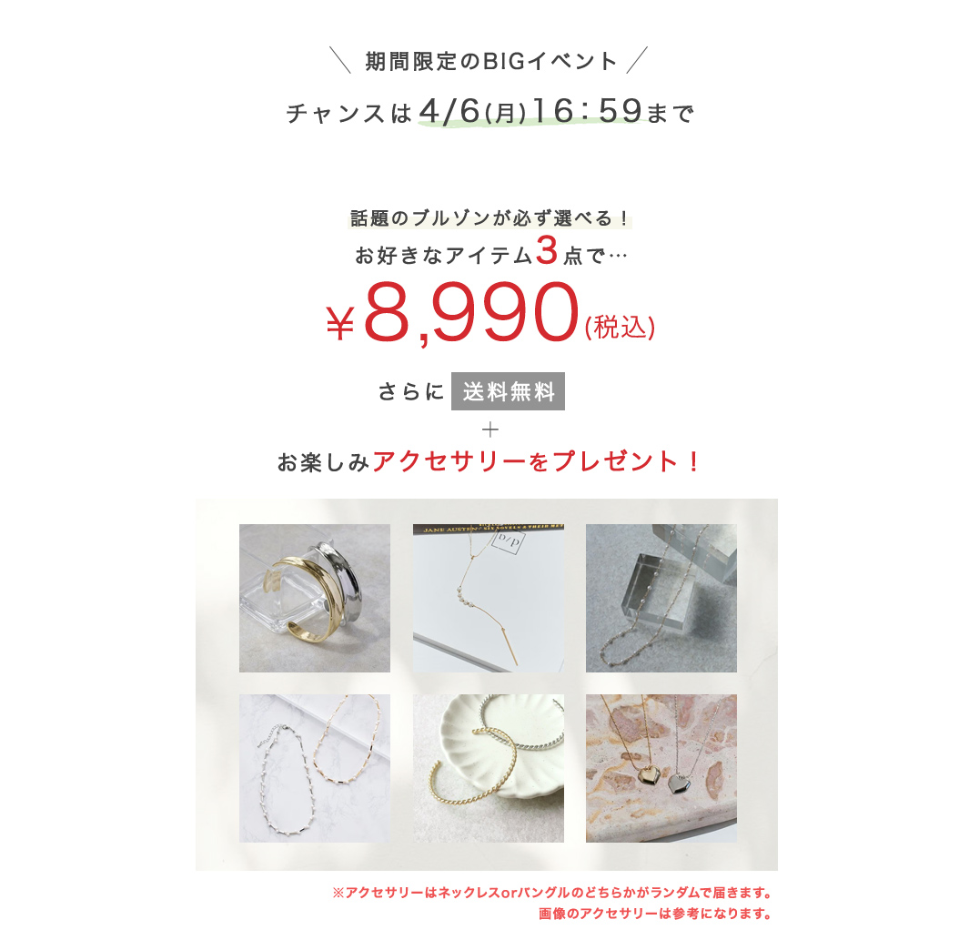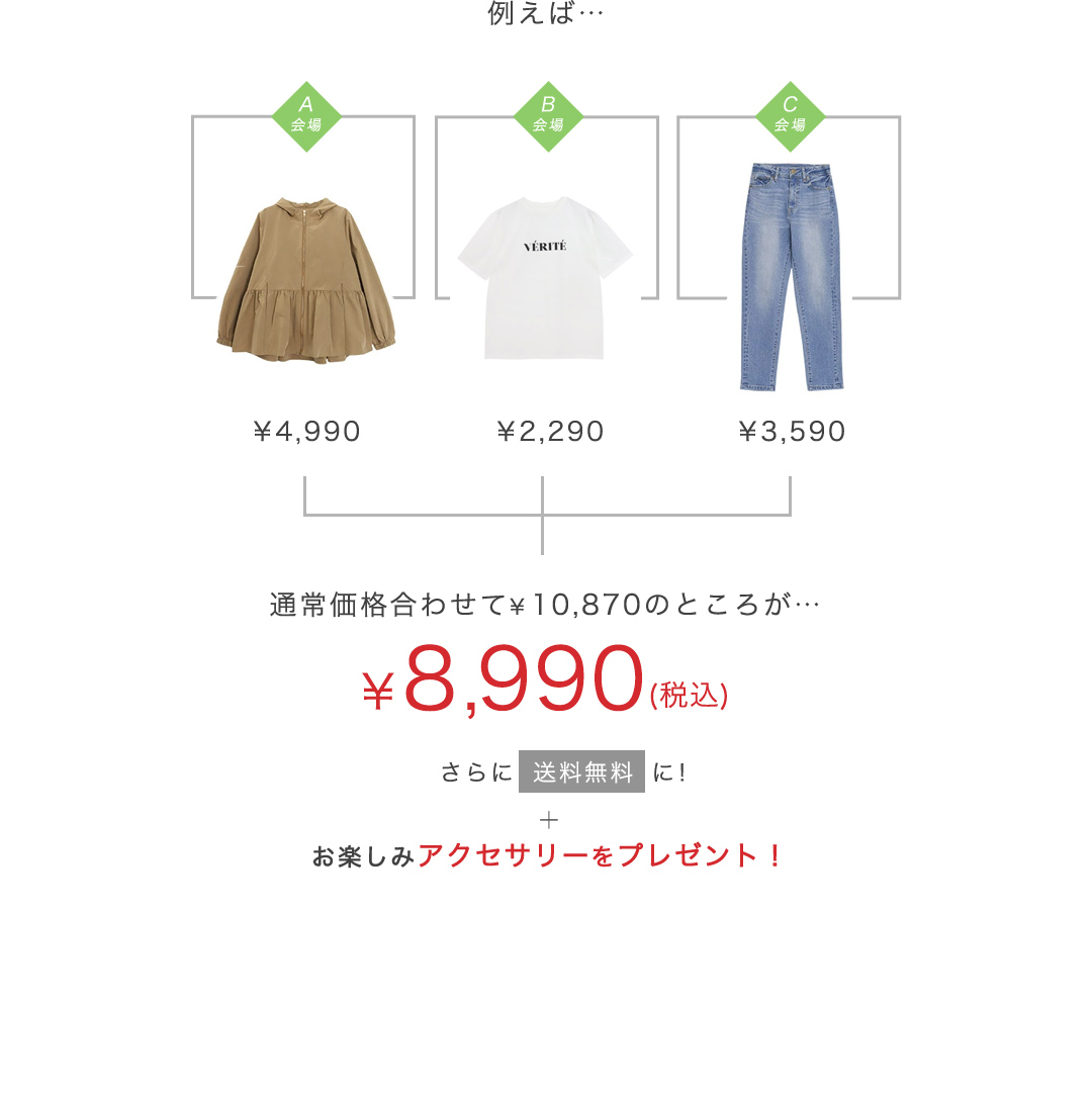 ・対象商品をA会場から1点、B会場から1点、C会場から1点、から1点ずつ計3点に満たない場合はまとめ割適応外となります。