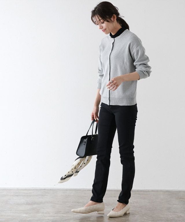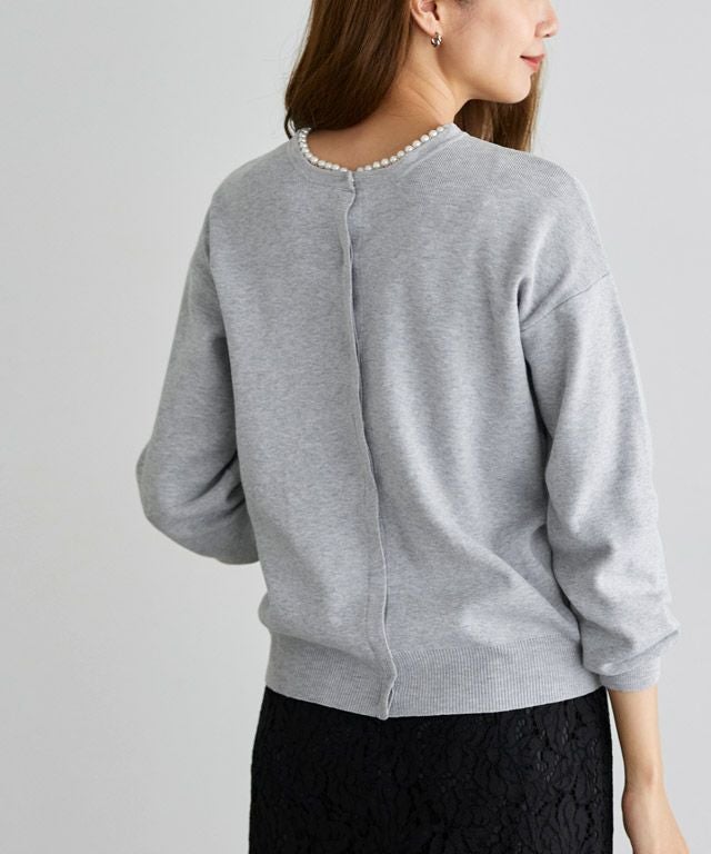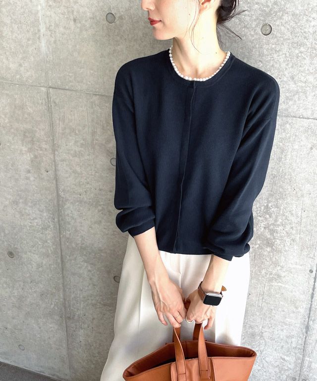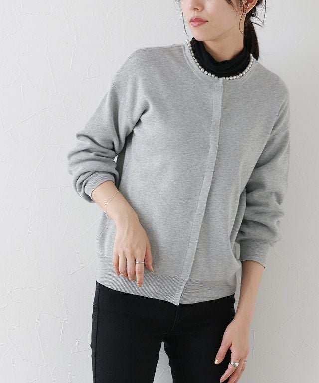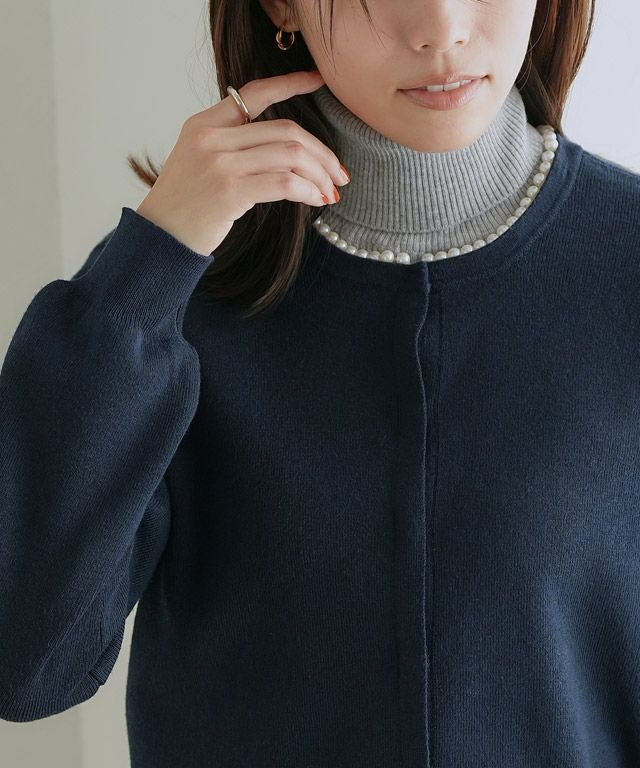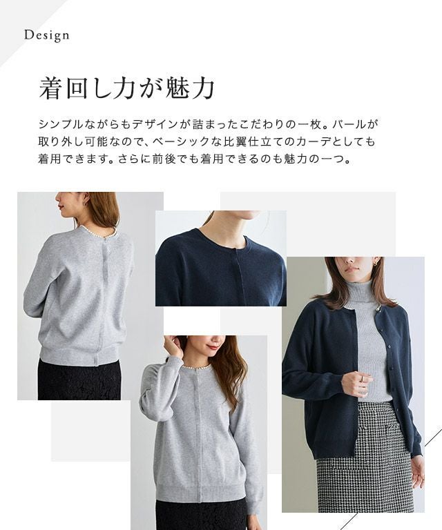 シンプルながらもデザインが詰まったこだわりの一枚。パールが取り外し可能なので、シンプルな比翼仕立てのカーデとしても着用できます。さらに前後でも着用できるのも魅力の一つ。