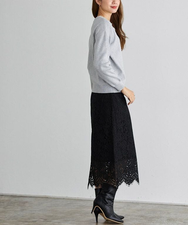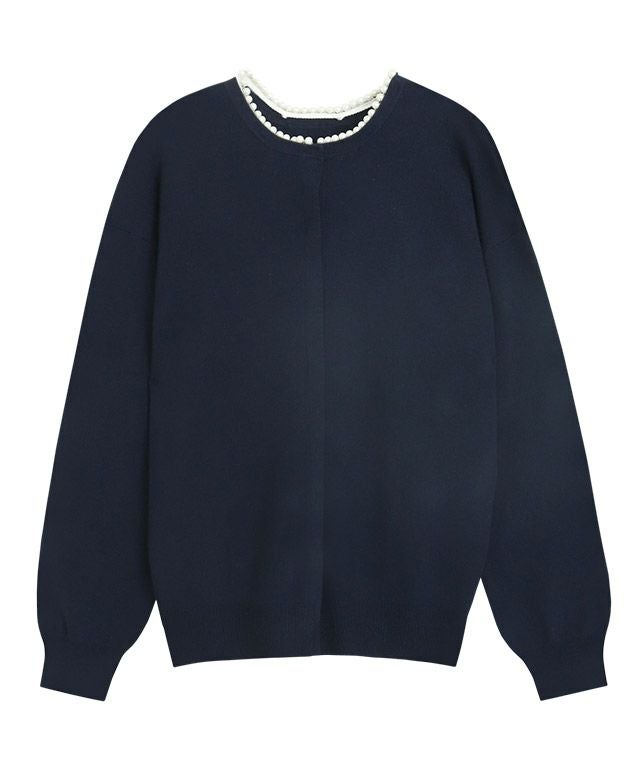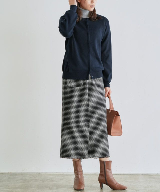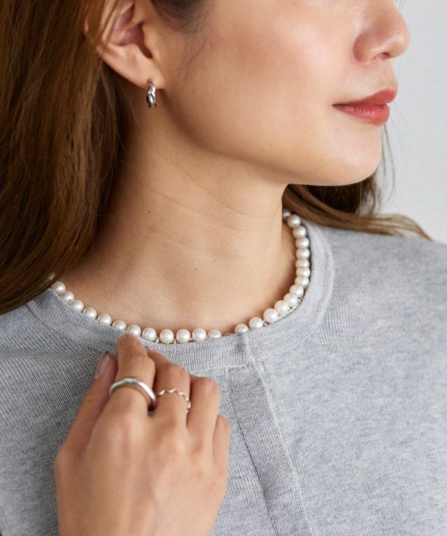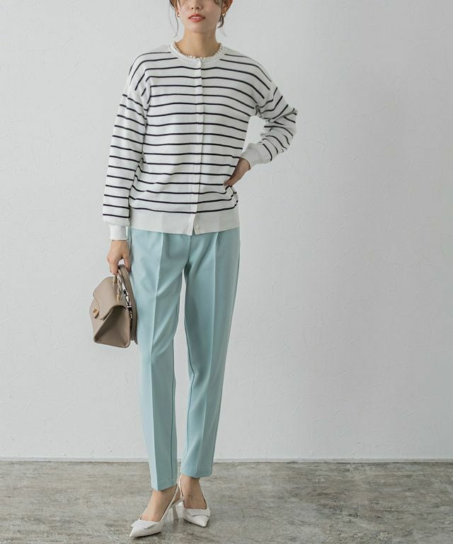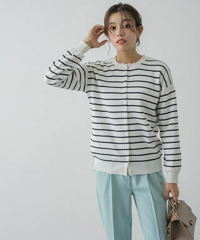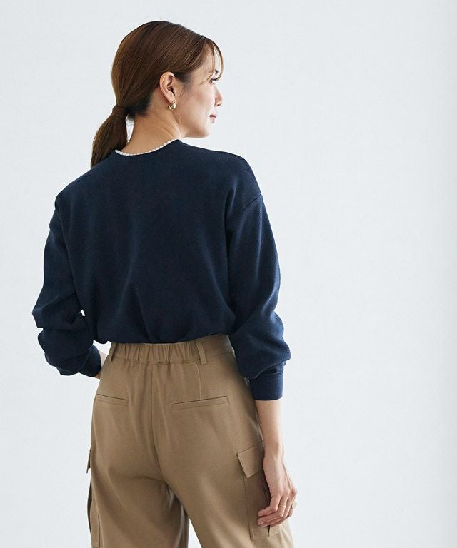 シンプルながらもデザインが詰まったこだわりの一枚。パールが取り外し可能なので、シンプルな比翼仕立てのカーデとしても着用できます。さらに前後でも着用できるのも魅力の一つ。