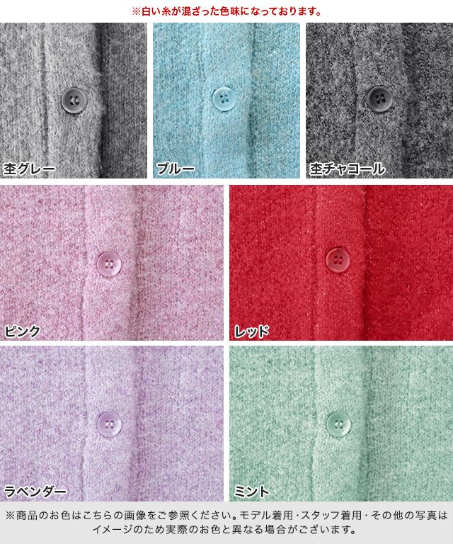 また、ニット製品は生産の過程上「生地を織る際の糸の継ぎ目」繊維の「混紡」、プレス加工、製品洗い加工によって形やサイズ(5cm前後)に誤差が生じる場合がございますが品質上の問題はございません。