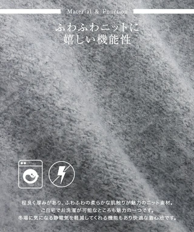 程良く厚みがあり、ふわふわの柔らかな肌触りが魅力のニット素材。ご自宅でお洗濯が可能なところも魅力の一つです。冬場に気になる静電気を軽減してくれる機能もあり快適な着心地です。
