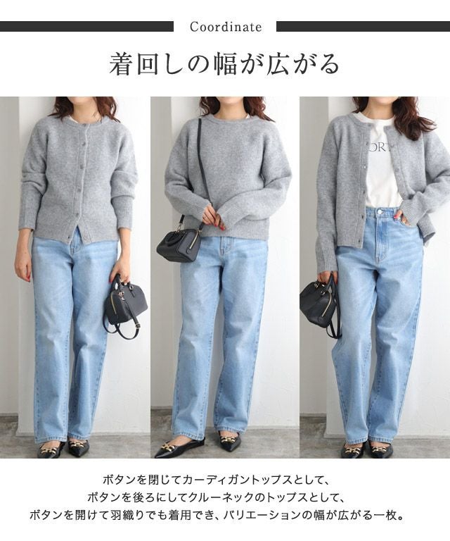 ボタンを閉じてカーディガントップスとして、ボタンを後ろにしてクルーネックのトップスとして、ボタンを開けて羽織りでも着用でき、バリエーションの幅が広がる一枚。デザインはシンプルですが、程良くゆとりのあるサイジングがこなれた印象に。一枚ではもちろん、ブラウスやカットソーなどをインナーに合わせたレイヤードスタイルもおすすめ◎
