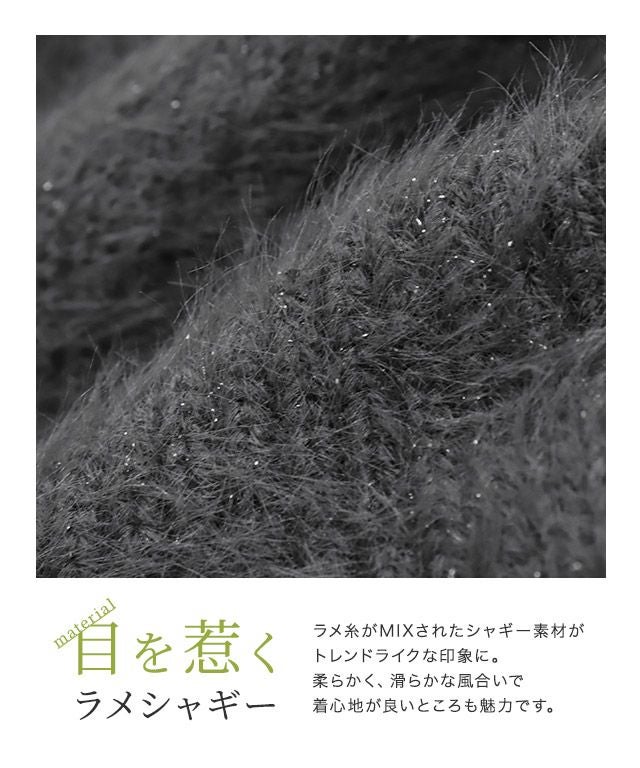 ラメ糸がMIXされたシャギー素材がトレンドライクな印象に。柔らかく、滑らかな風合いで着心地が良いところも魅力です。