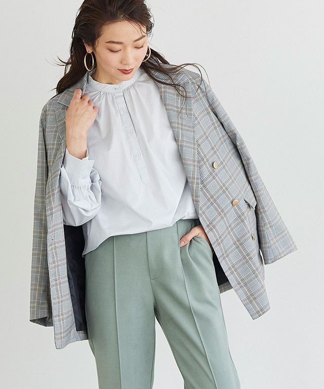 肩と手首に施したギャザーは、生地をたっぷりと使用しているためボリューム感があり、旬なスタイリングへと導きます。