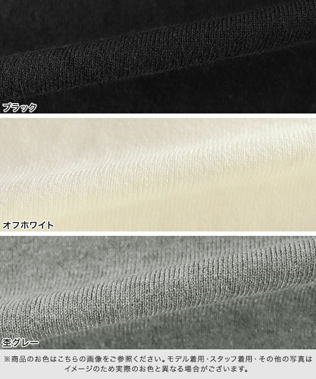 また、ニット製品は生産の過程上「生地を織る際の糸の継ぎ目」繊維の「混紡」、プレス加工、製品洗い加工によって形やサイズ(5cm前後)に誤差が生じる場合がございますが品質上の問題はございません。