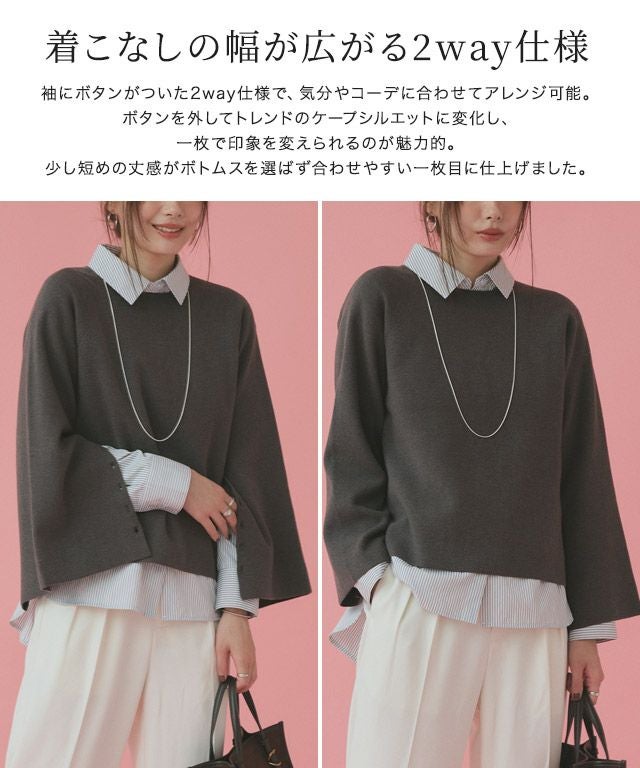 袖にボタンがついた2way仕様で、気分やコーデに合わせてアレンジ可能。ボタンを外してトレンドのケープシルエットに変化し、一枚で印象を変えられるのが魅力的。少し短めの丈感がボトムスを選ばず合わせやすい一枚に仕上げました。