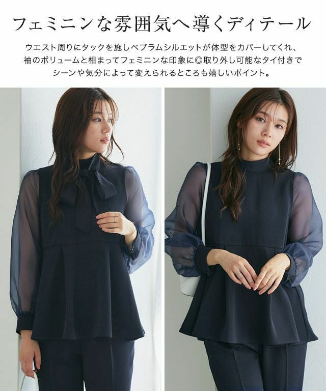 きちんと感もあって、トレンドさもプラスする“タイ付き袖オーガンジーペプラムセットアップ”