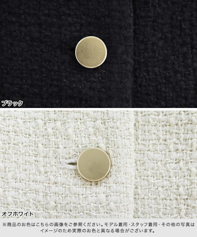 ワンランク上のスタイリングに“ツイードノーカラージャケット” シーズンムード高まるツイード素材を使用し、一枚でこなれ感を演出します。 ノーカラーデザインで、すっきりとした上品な印象のスタイリングに。ゴールドボタンがアクセントになり、大人な雰囲気を醸し出します。 【ブランド】 Pierrot(ピエロ)