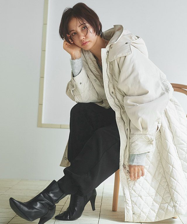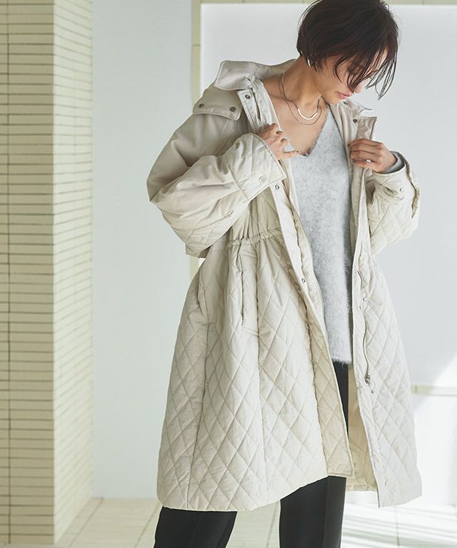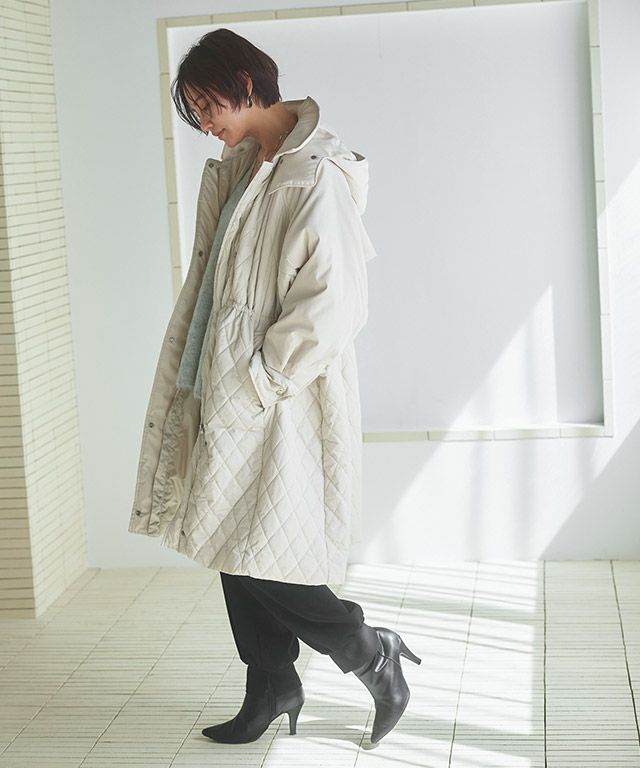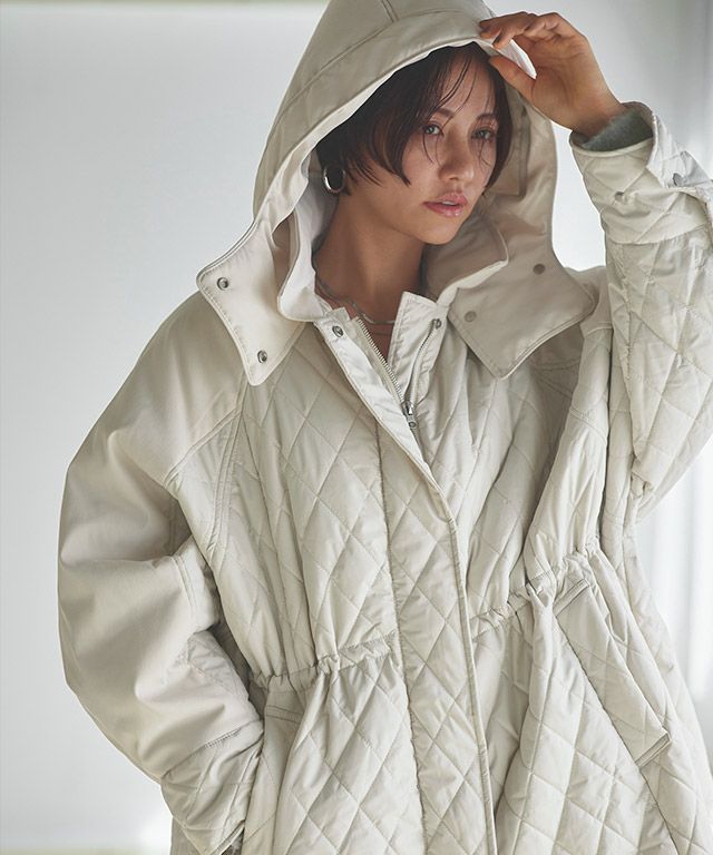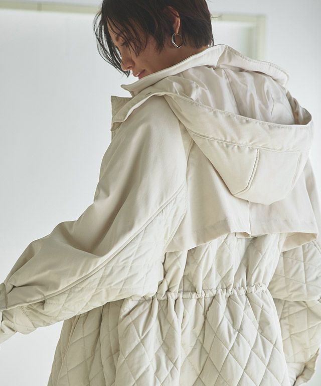 羽織るだけでキルティング素材が目を惹く主役級アウター。内側のドロストコードできゅっと絞ると女性らしいフレアシルエットが完成します。ラグランスリーブでカジュアルな雰囲気ながらもバックのヨークデザインで上品さも取り入れました。フードは取り外し可能なのでシーンに合わせてスタイリングを楽しめます。