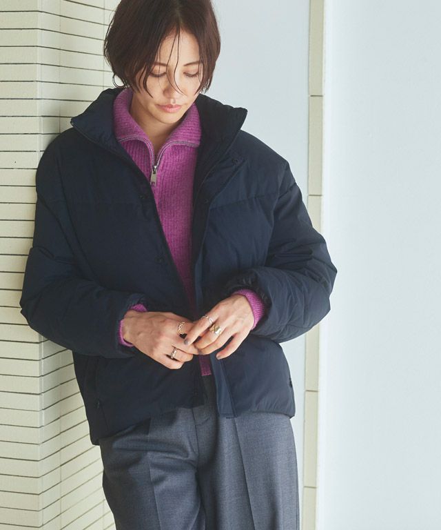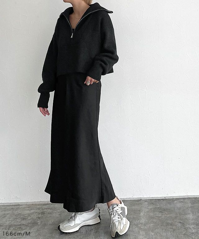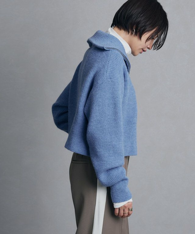 シルバーのハーフジップがアクセントになったニットトップス。ボクシーなシルエットと、コンパクトなクロップド丈がルーズになりすぎずミニマルな印象に。ハイネックインナーやシャツなどのレイヤードスタイルもバランスよく着こなせる一枚です。