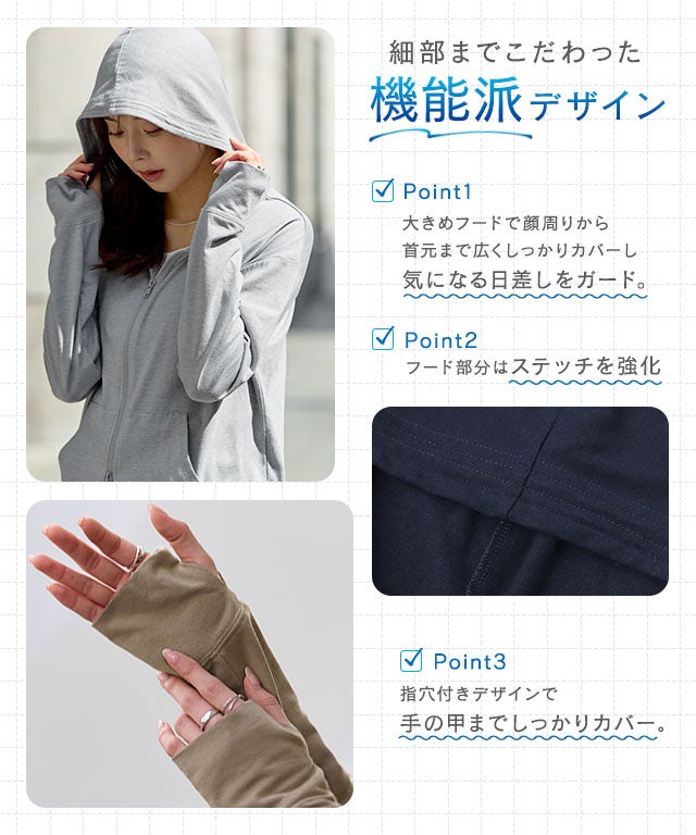 ヒップまで隠れる丈感で、さりげない体型カバーも叶えるデザイン。大きめのフードや首元までカバーできる仕様で、気になる日差しからしっかりガードします。ダブルジップ仕様でシルエットのアレンジも可能。指穴付きで手元までしっかり覆えるのも嬉しいポイントです。機能性と着回しやすさを兼ね備えた、これからの季節に頼れる一枚に仕上げました。