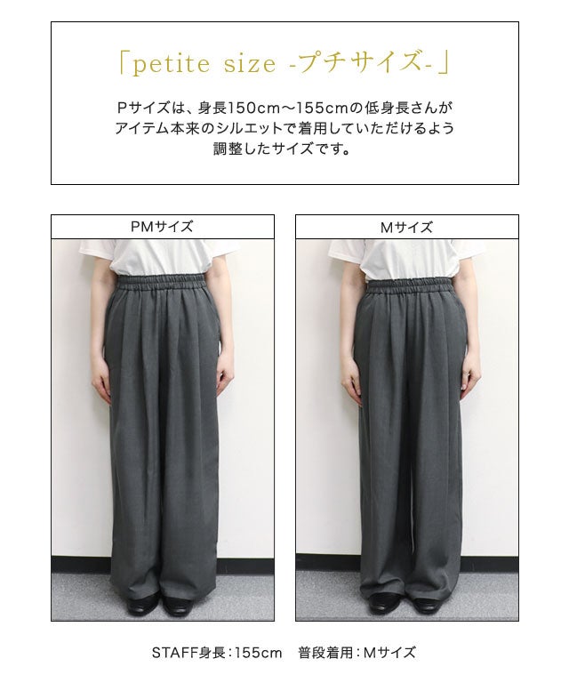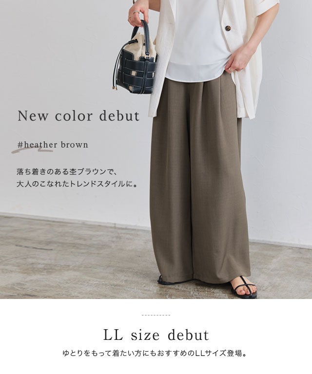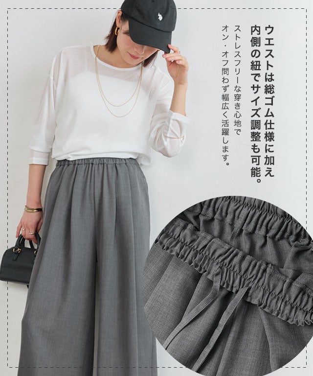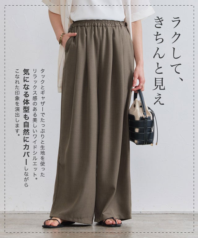 タックとギャザーでたっぷりと生地を使い、リラックス感のある美しいワイドシルエットに。気になる体型も自然にカバーしながら、こなれた印象を演出します。ウエストは総ゴム仕様に加え、内側の紐でサイズ調整も可能。ストレスフリーな穿き心地で、オン・オフ問わず幅広く活躍します。