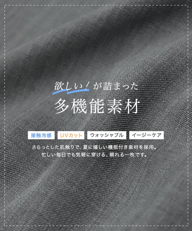 軽やかで涼しげな印象を与える、リネンライク素材のワイドパンツ。さらっとした肌触りで、接触冷感・UVカット・ウォッシャブル・イージーケアと、夏にうれしい多機能素材を採用。忙しい毎日でも気軽に穿ける、頼れる一枚です。