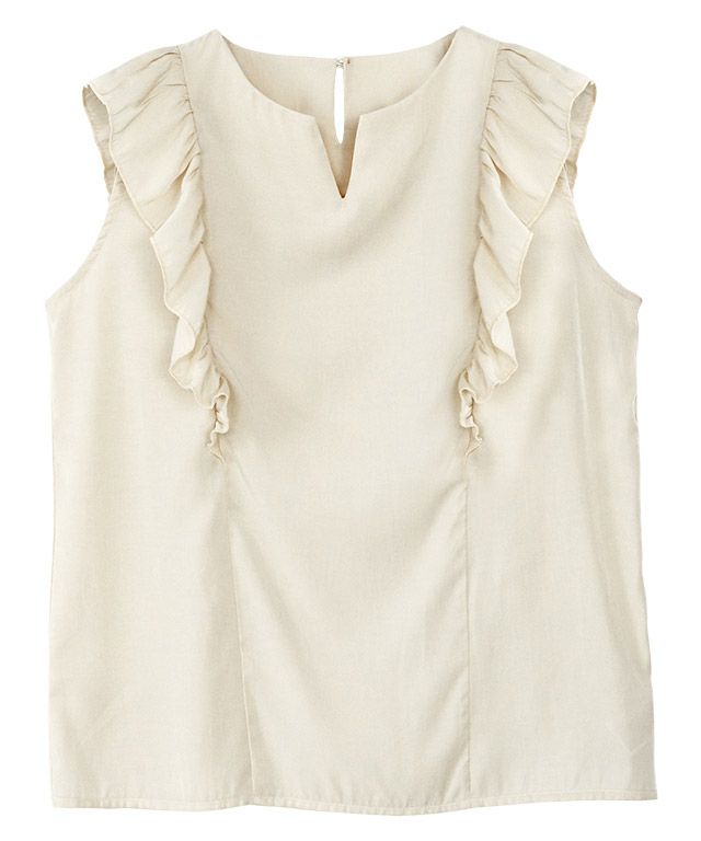 肩のフリルがアクセントになり、華奢に見せてくれるデザインブラウス。キーネックで抜け感と上品さをプラスしました。きれいめにもカジュアルにも着回せるアイテムです。