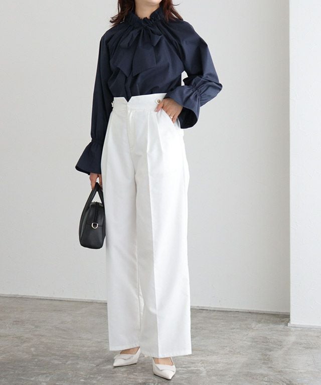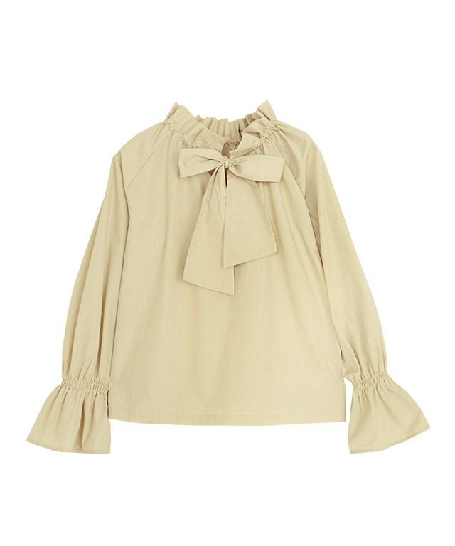 顔周りを華やかな印象へと導くスタンドフリルカラーと、シャーリングデザインで、りぼんを絞ってもそのまま垂らしてもサマになる一枚。シーンや気分によって幅が広がる前後2way仕様。袖はキャンディースリーブにし、抜け感とアクセントをプラス。一枚ではもちろん、ニットやベスト、ジレなどとのレイヤードしたスタイルもオススメです。