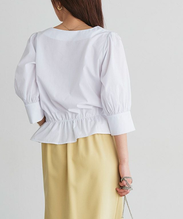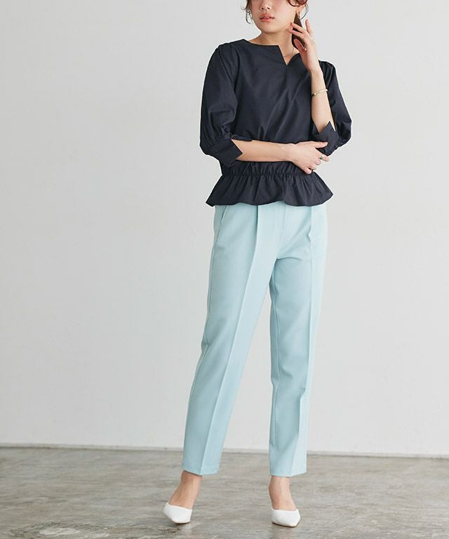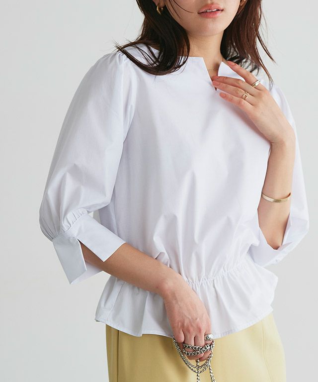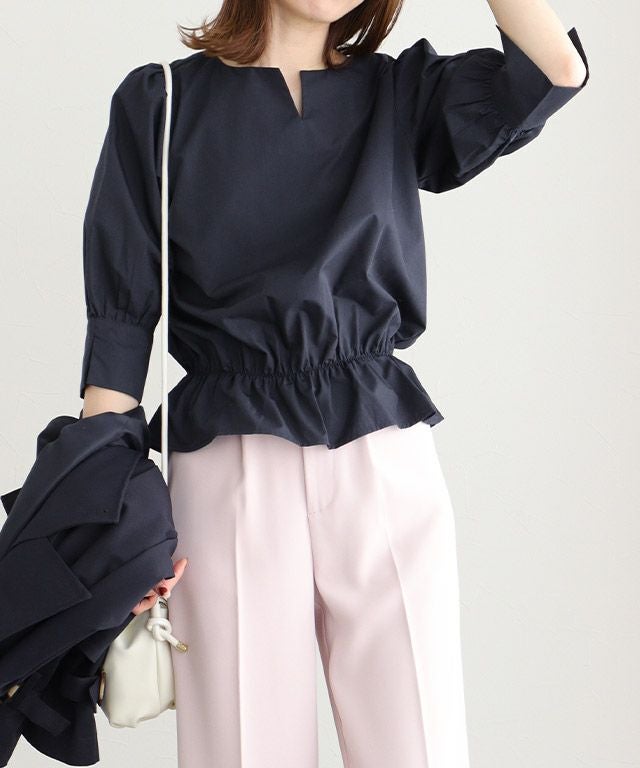 程良くフェミニンなデザインが着映え感を引き立てる主役級ブラウス。キーネックにすることでデコルテのキレイ見えを叶えます。ボリュームのある袖デザインは二の腕周りをカバー◎ウエストに施したギャザー切替でスタイルアップが実現するところも嬉しいポイント。幅広いシーンで大活躍の一枚です。