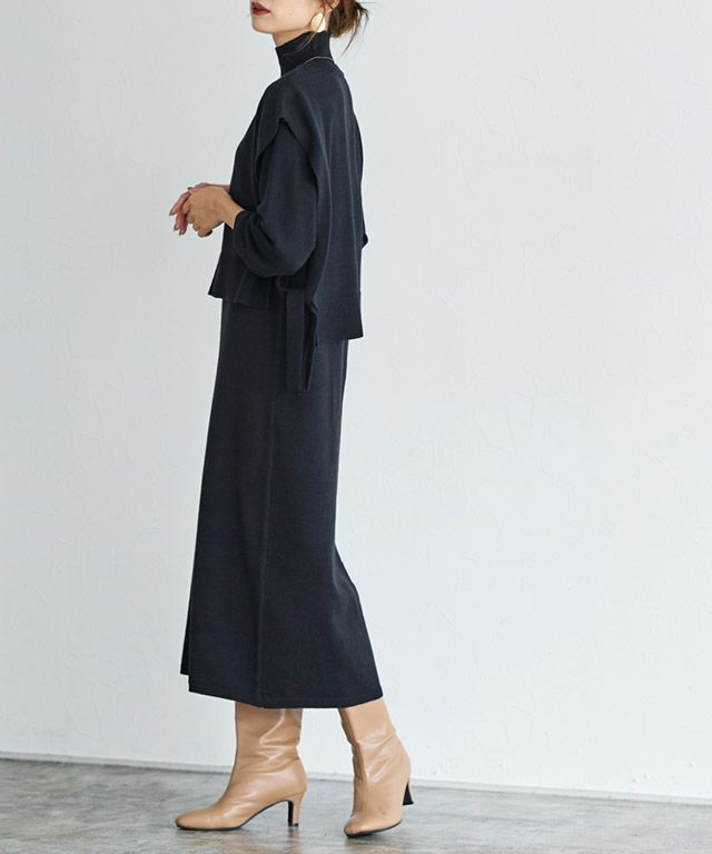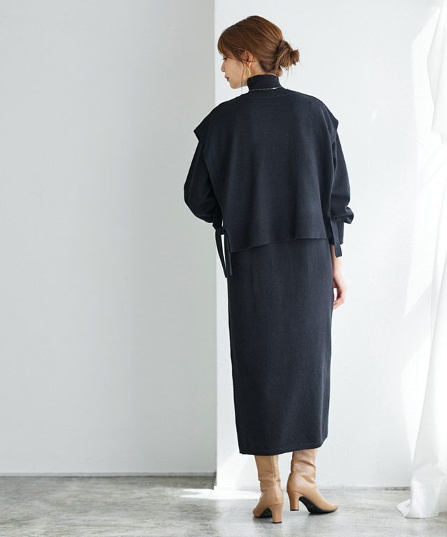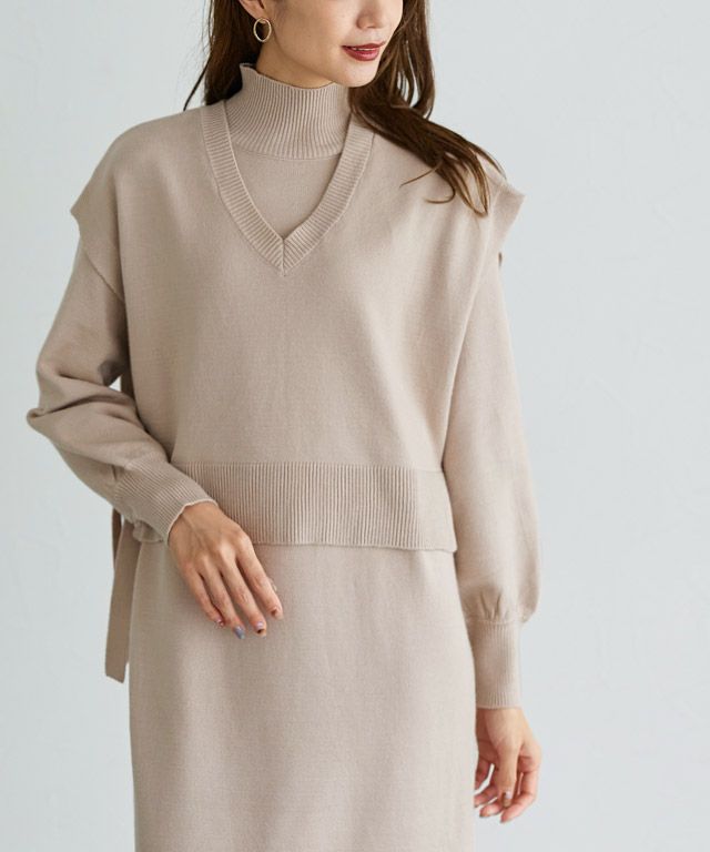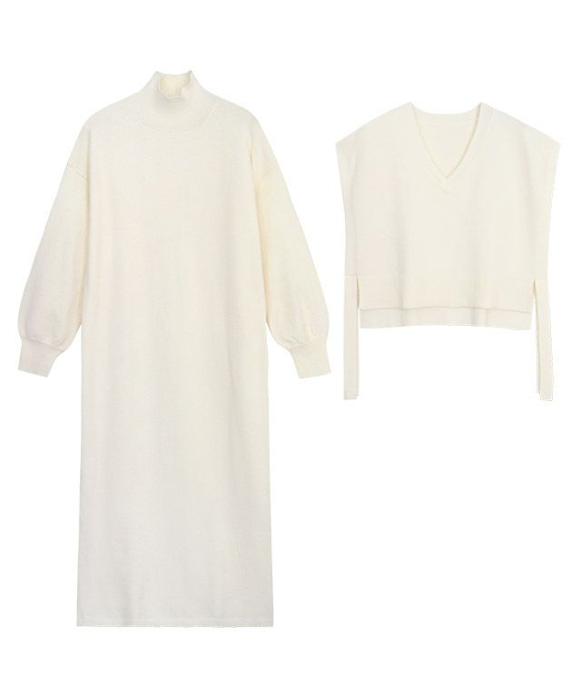 オーバーシルエットのVネックベストと、Iラインのハイネックワンピースのセットアップ。セットで着用することで、トレンド感のあるレイヤードスタイルが叶います。ワンピースは一枚でも着用でき、ベストは他のトップスとのレイヤードにも着回すことができます。