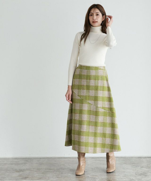 表面に毛羽のあるウール素材を使用することで、見た目にも着心地にも季節感のあるスカート。カラーの入ったチェック柄で、コーディネートが華やかに仕上がります。