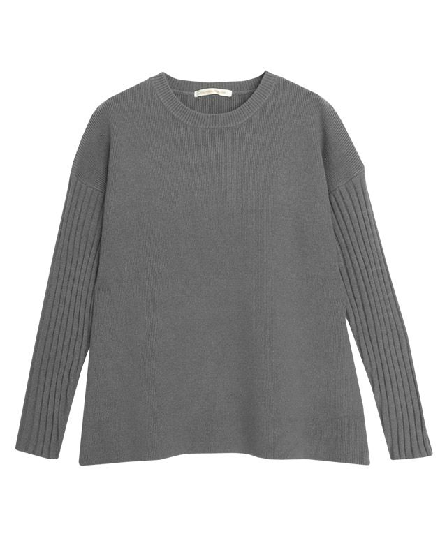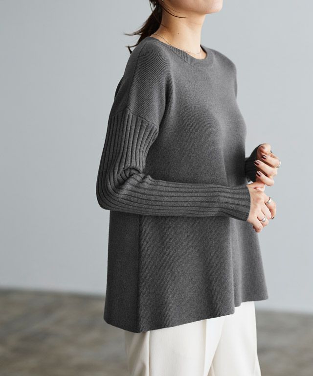 裾に向かってふんわり広がるAラインシルエットで女性らしい印象に導き、ウエスト周りの体型カバーができるところも嬉しいポイント。裾周りはフレアラインなので、袖はリブですっきりとメリハリをつけて仕上げました。