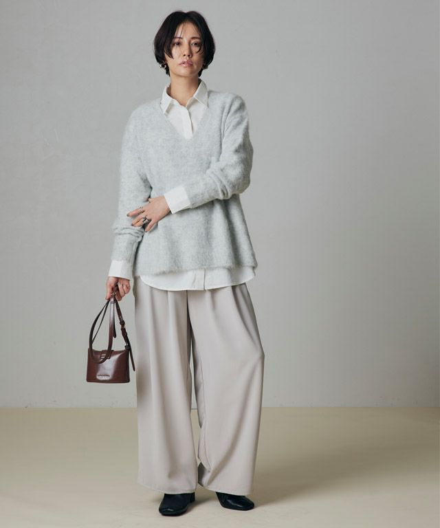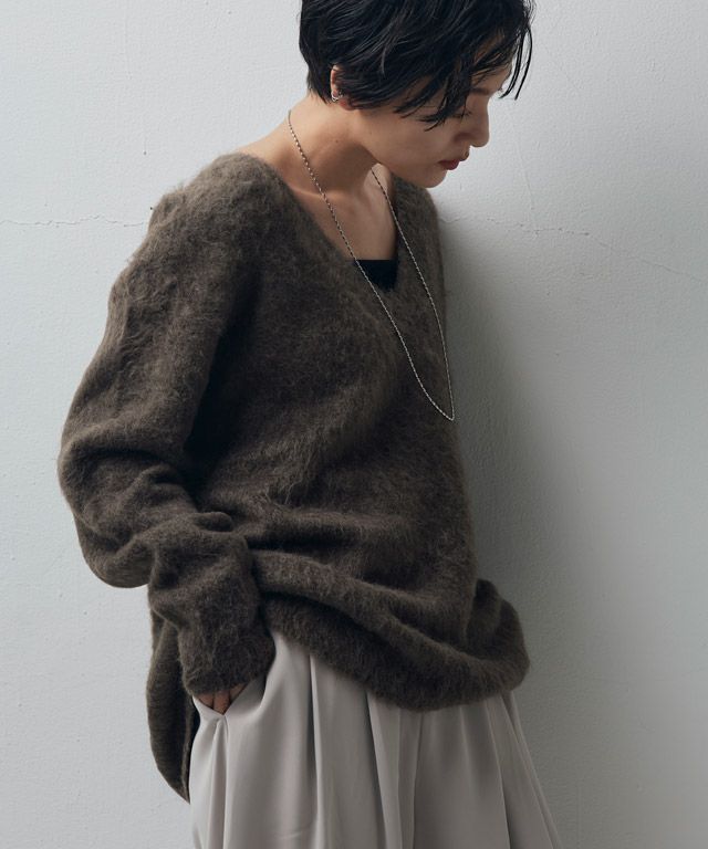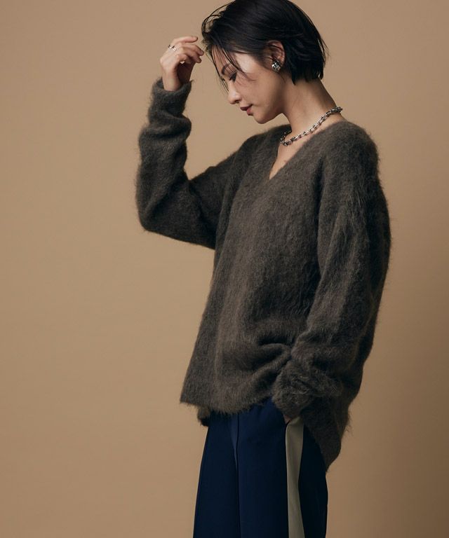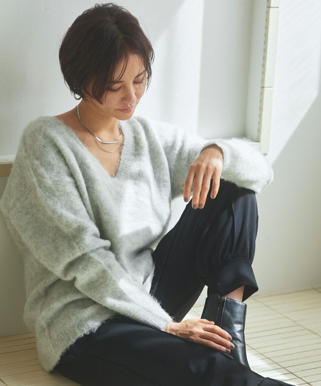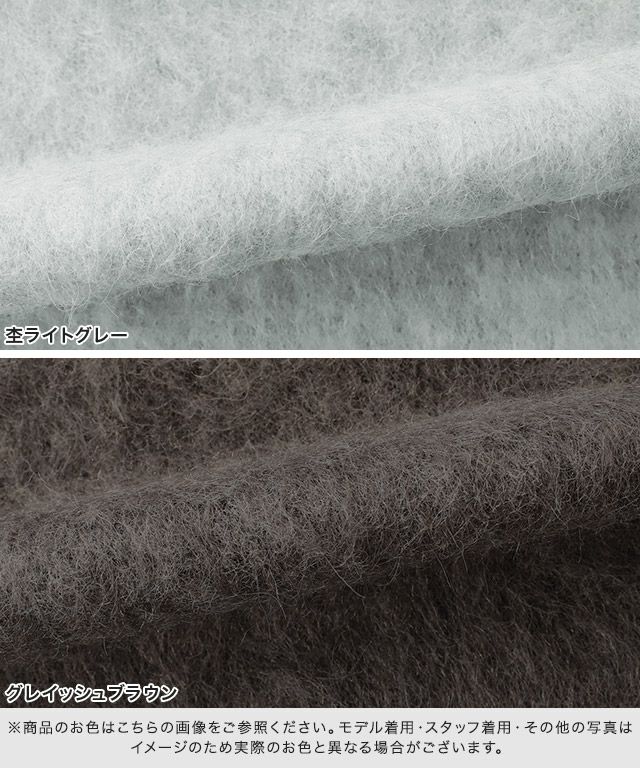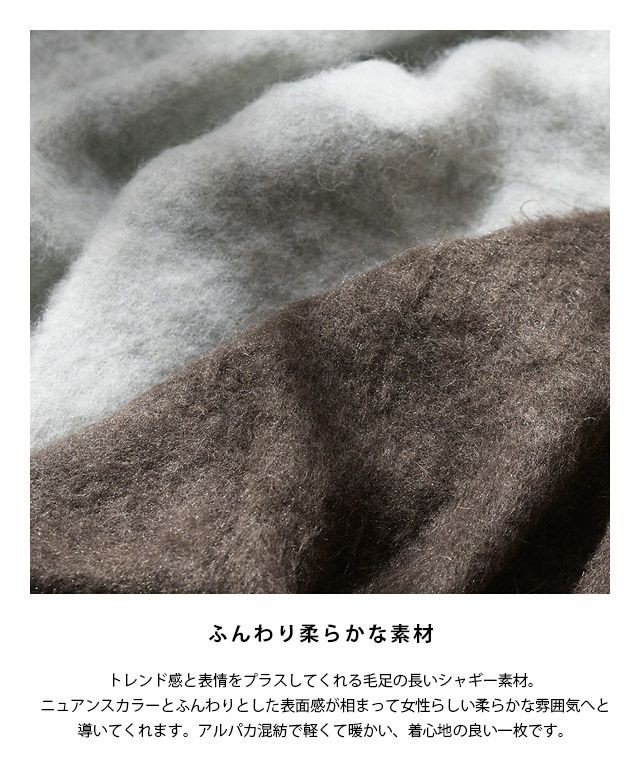 トレンド感と表情をプラスしてくれる毛足の長いシャギー素材。ニュアンスカラーとふんわりとした表面感が相まって女性らしい柔らかな雰囲気へと導いてくれます。アルパカ混紡で軽くて暖かい、着心地の良い一枚です。