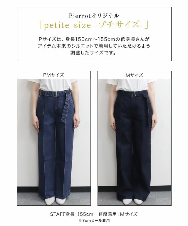 共生地のベルトがアクセントな着映えデニム。裾に向かって程良く広がるセミワイドシルエットと、ハイウエストデザインが細見えを叶えてくれるところも嬉しいポイント。フロントにはピンタックを施すことで脚のラインをきれいに見せてくれ、きちんと感のある印象に。お洗濯で消えないところも魅力の一つです。