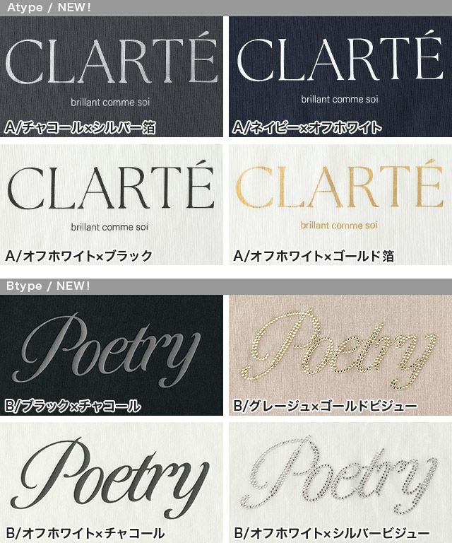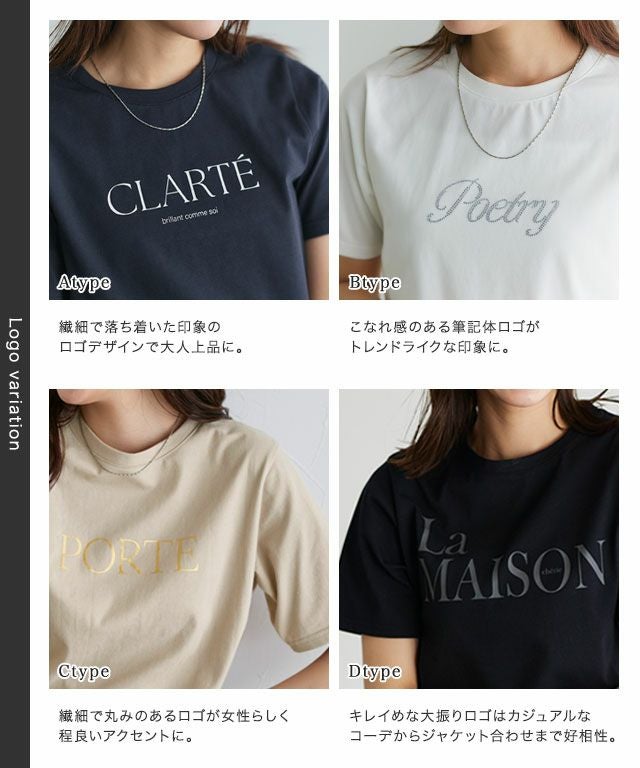 STORY・美人百花 5月号掲載/ 【イージーケア】選べるロゴTシャツ 滑らかな表面感がカジュアルながらも上品な印象を与えます。程良くハリがあり綺麗なシルエットを保ち、シワになりにくくお手入れが簡単なところも魅力の一つです。 開き過ぎないネックラインが旬な印象に。インナーとしても着用しやすい一枚に仕上げました。程よくゆとりを持たせたサイズ感で、体のラインを拾わないところも嬉しいポイントです。 A:フランス語で""光、自分らしく輝く""の意味。繊細なラインが上品で、大人っぽいスタイリングに仕上がります。 B:Poetry(ポエトリー)はフランス語で”詩”の意味。トレンドライクな筆記体デザインがこなれ感を引き立てます。 C:華奢なロゴが派手すぎず程良いアクセントになってくれます。インナーとしても着回しやすく、丸みのあるロゴが女性らしい雰囲気に◎ D:【La Maison-cherie-】La Maison(ラ・メゾン)はフランス語で”家・家庭”の意味。Cherie(シェリー)は”大切な人”の意味。大振りのロゴは、カジュアルなスタイリングはもちろん、フォントもキレイめの印象があるので、ジャケットなどキレイめなスタイルとの相性も良いです。 【ブランド】 Pierrot(ピエロ)