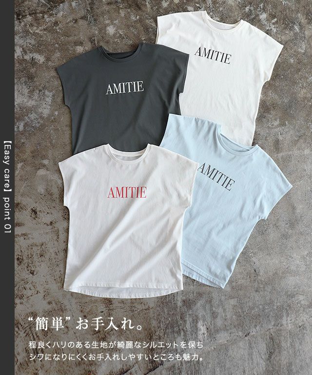 明朝体のロゴにすることで、ロゴTでもカジュアルすぎない上品な印象に仕上げました。肩周りを程良くカバーしてくれるフレンチスリーブが女性らしい。身頃もゆとりがあり体系カバーも◎フレンチスリーブなので、カーデやシャツなどのインナーとしても着回しやすい一枚です。