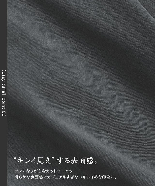 滑らかな表面感がカジュアルながらも上品な印象を与えます。程良くハリがあり綺麗なシルエットを保ち、シワになりにくくお手入れが簡単なところも魅力の一つです。