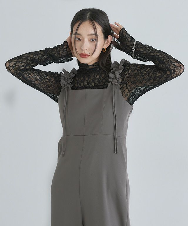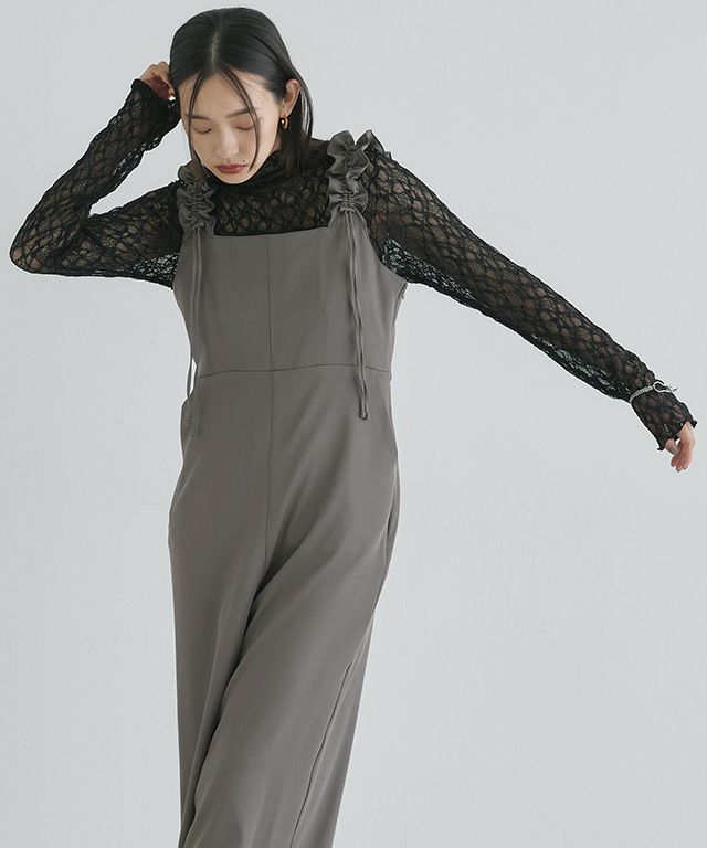 ショルダー部分に贅沢に施したフリルが効いた女性らしいオールインワン。肩のドロスト部分でパンツの長さが調整可能です。ウエスト部分にはシルエットを引き締めるデザインが施され、スタイルアップ効果も期待できます。後ろはリボンディテールで360度どこから見ても着映えるデザインです。