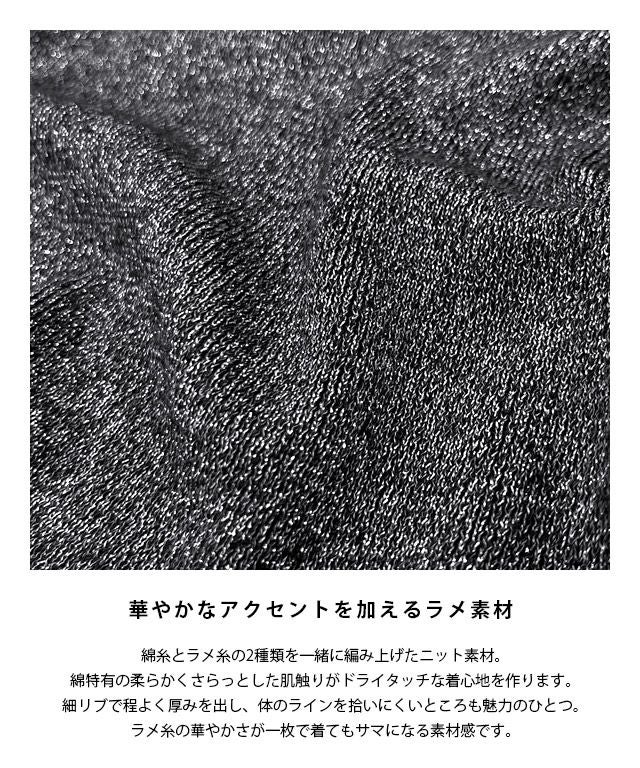 綿糸とラメ糸の2種類を一緒に編み上げたニット素材。綿特有の柔らかくさらっとした肌触りがドライタッチな着心地を作ります。細リブで程よく厚みを出し、体のラインを拾いにくいところも魅力のひとつ。ラメ糸の華やかさが一枚で着てもサマになる素材感です。