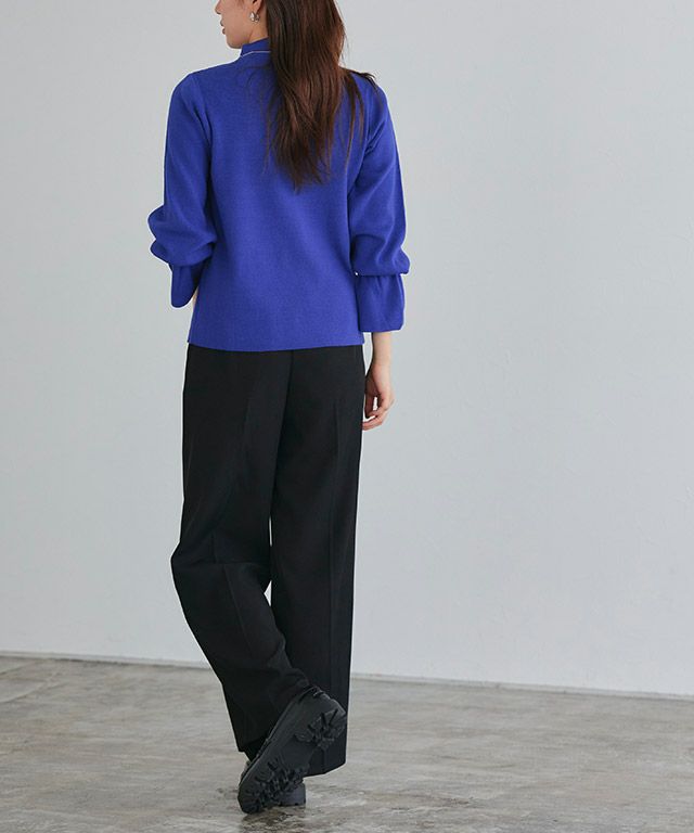 身頃はシンプルなデザインなので、様々なスタイリングに着回しやすい一枚。ハイネックデザインと、袖口にキャンディデザインをあしらうことで、スタイリングをこなれ感のある印象に導きます。