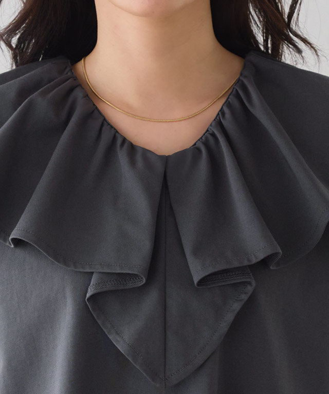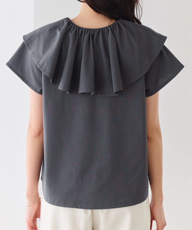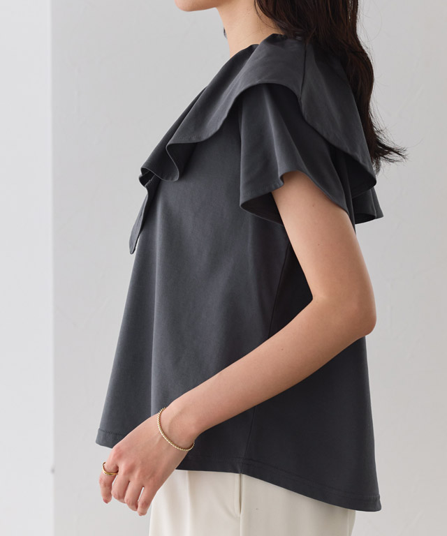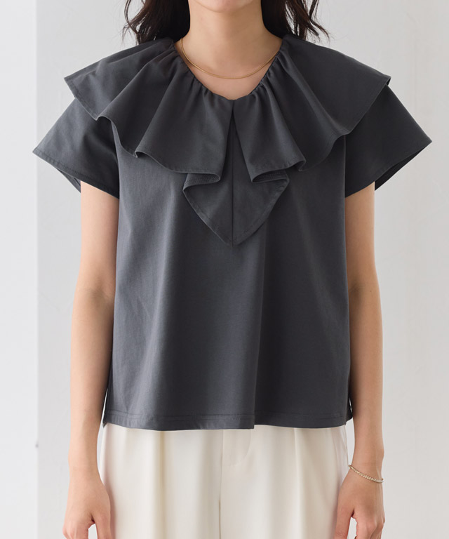 襟元にあしらったフリルが顔まわりに表情をプラスし、シンプルな中にもアクセントのある一枚に。カットソー素材で取り入れやすく、デイリーに活躍。シンプルながらも着回しやすいアイテムです。