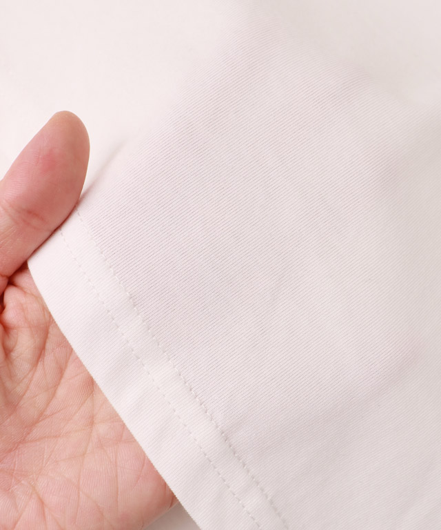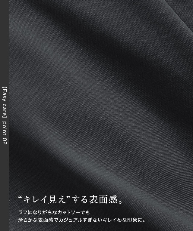 滑らかな表面感がカジュアルながらも上品な印象を与えます。程良くハリがあり綺麗なシルエットを保ち、シワになりにくくお手入れが簡単なところも魅力の一つです。