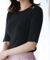 シンプルながらも肩のボタンがアクセントになったニット。ゴールドボタンで上品さがあり、トレンドのマリンスタイルにぴったりな一枚。二の腕まで隠れる五分袖も嬉しいポイントです。ボトムスを選ばず合わせやすいデザイントップスです。