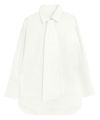 一見シンプルでベーシックなシャツに、クラシカルなロングカフスがアクセントを加えています。取り外し可能なボウタイは、インパクトのあるワイドデザインで顔周りを華やかに見せてくれます。ニットやアウターとレイヤード出来るように身頃はすっきりと仕上げました。ハンサムなスタイルから女性らしいスタイルまで、幅広い着こなしに対応できるアイテムです。 ボウタイスタイルの時には、襟を内側に折り込むことで、ボウタイが邪魔にならずにすっきりと着用できます。