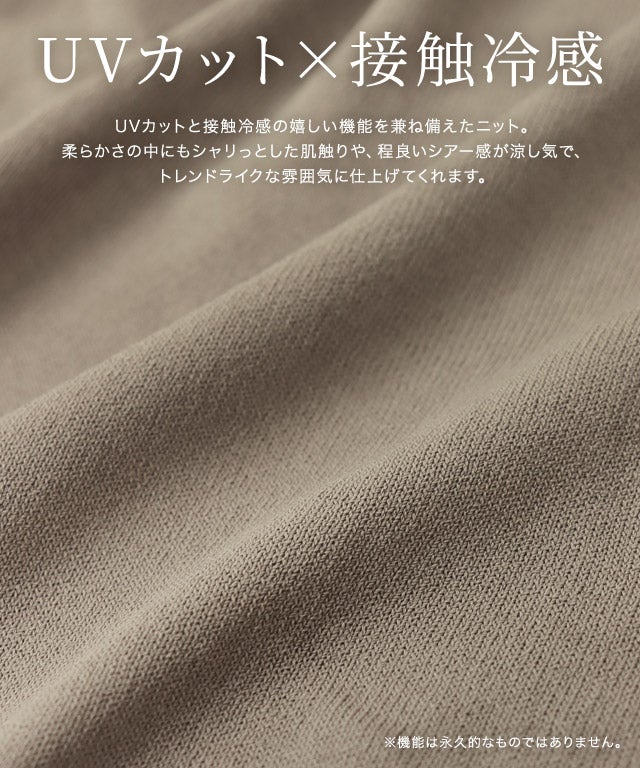 UVカットと接触冷感の嬉しい機能を兼ね備えたニット。柔らかさの中にもシャリっとした肌触りや、程良いシアー感が涼し気で、トレンドライクな雰囲気に仕上げてくれます。