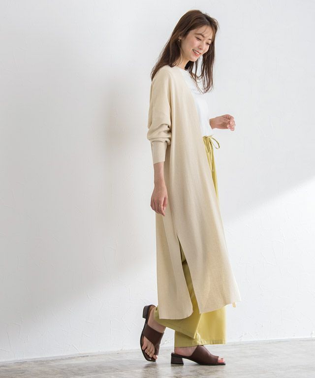 ロング丈が今年らしいロングカーディガンは、サイドに深めのスリットを入れることでボトムを選ばず合わせやすいデザインに。