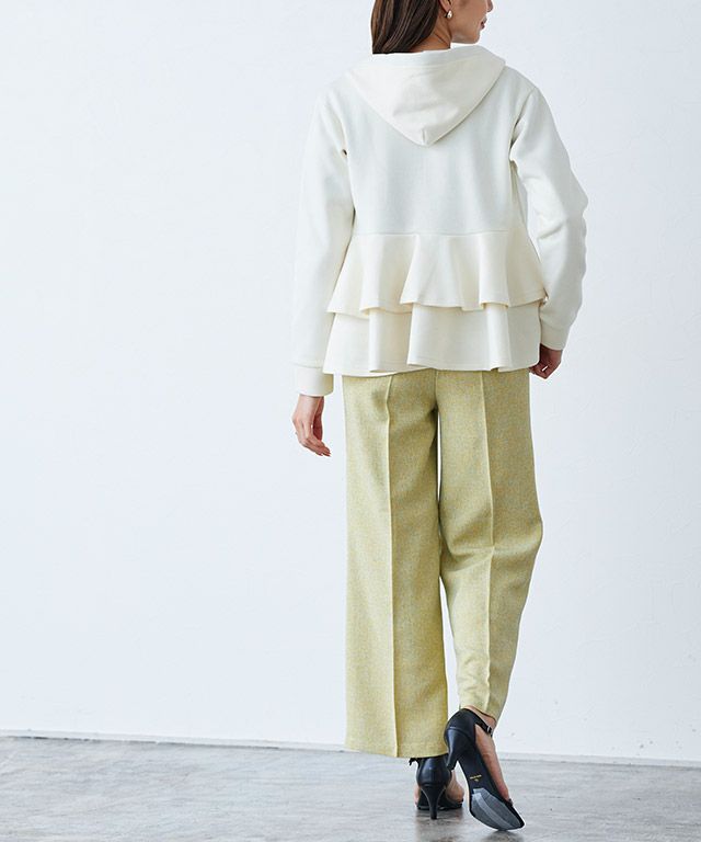 バックスタイルに施したフレアデザインが、バックスタイルにアクセントをプラス。シンプルなコーディネートにさっと羽織るだけでサマ見えします。グログランのリボンテープが女性らしさを醸し出し、リボン先にプレートを付けることで高見えするパーカーに仕上げました。