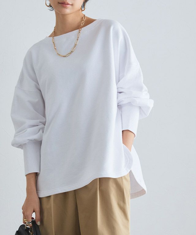 ゆったりとしたシルエットにボートネックを組み合わせ、洗練された印象に。 ロングリブが全体を引き締め、さりげなく大人の抜け感をプラス。 カジュアルにもモードにも、幅広いスタイリングにマッチします。