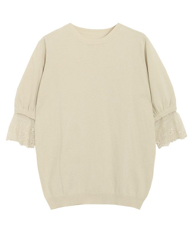 一番の魅力は、袖にあしらったレース。シンプルなボトムスに合わせるだけで、フェミニンなスタイリングが完成します。袖のレースが、さらにきちんと感のある印象。