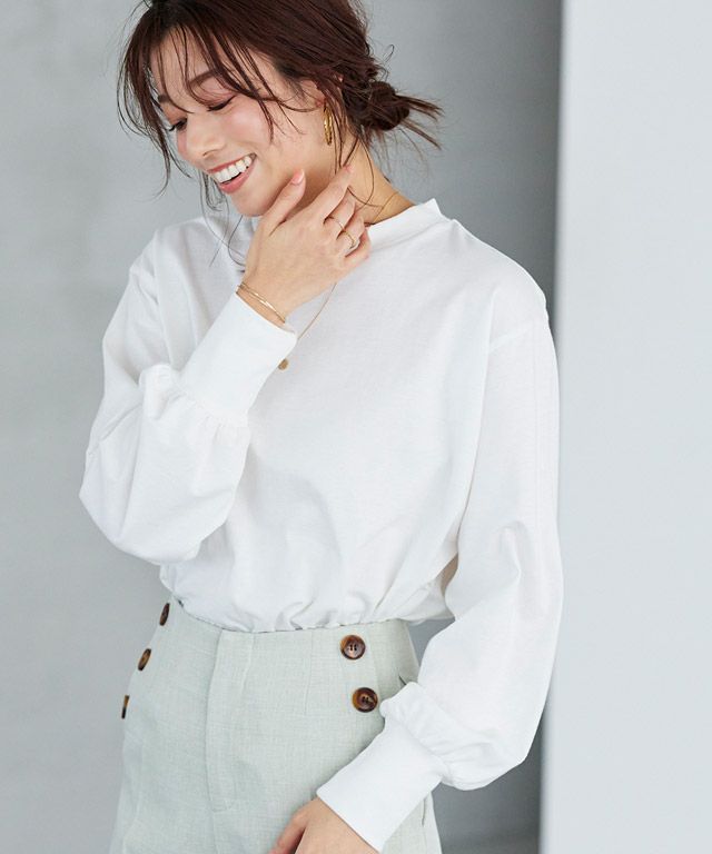 程良くふんわりとしたバルーン袖に、メリハリのあるリブデザインが女性らしい印象のトップス。ハイネックで上品かつお洒落な雰囲気に仕上げました。一枚ではもちろん、ジャケットのインナーやジレ、ジャンスカなどのレイヤードにも着回しやすい一枚です。