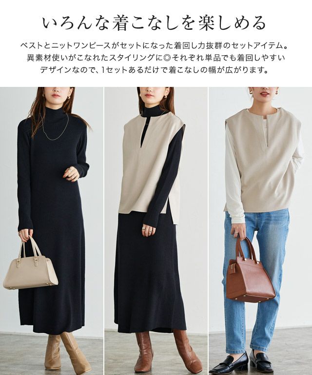 ベストとニットワンピースがセットになった着回し力抜群のセットアイテム。異素材使いがこなれたスタイリングに◎それぞれ単品でも着回しやすいデザインなので、1セットあるだけで着こなしの幅が広がります。