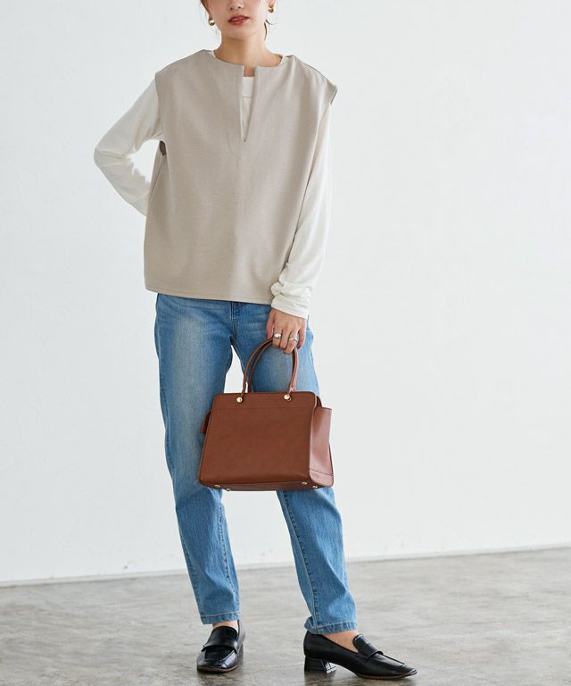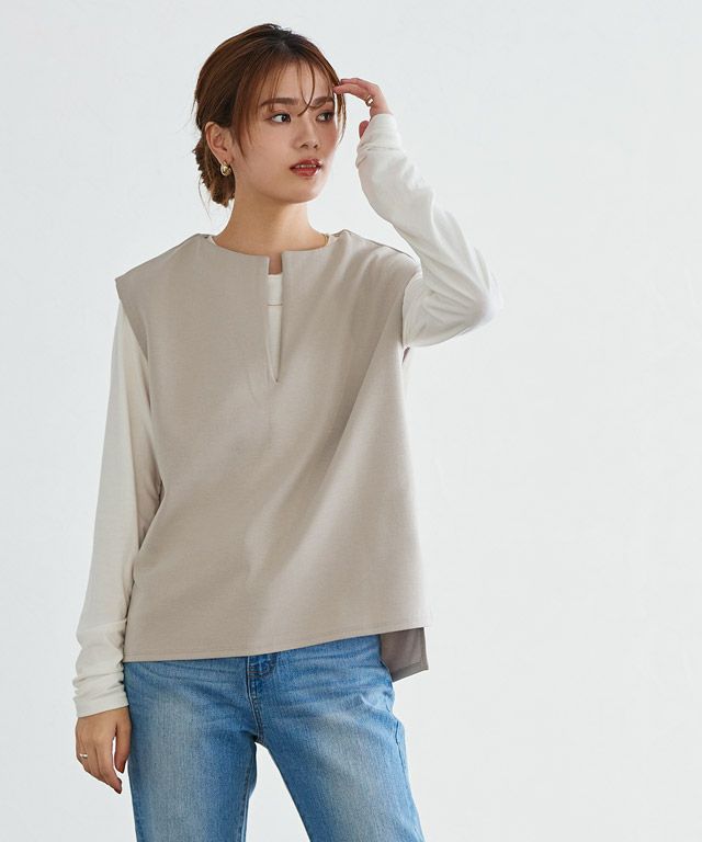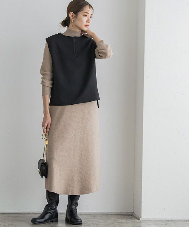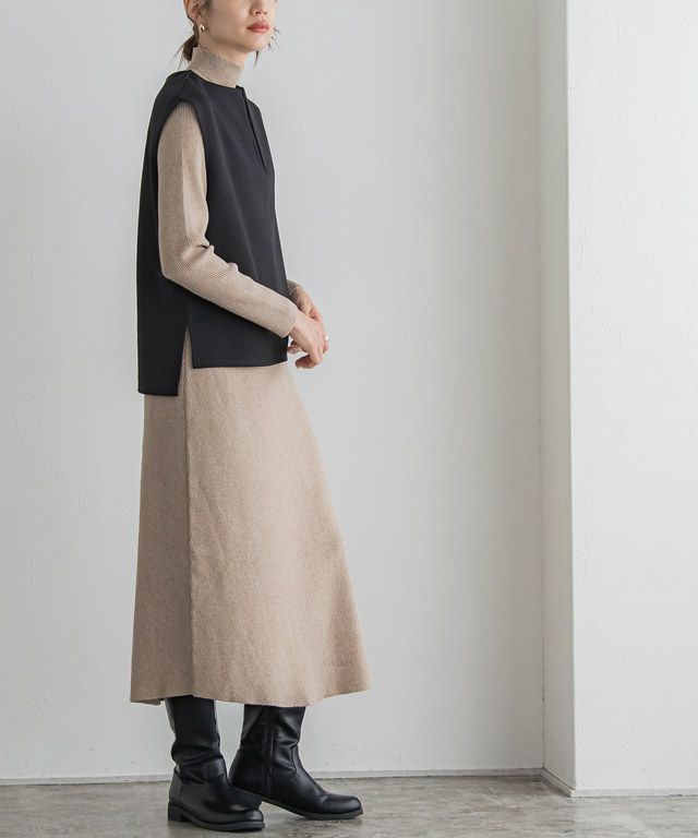 ベストはカジュアルな雰囲気の薄手のダンボール素材。カットソーでもしっかり感があり、きれいめにもカジュアルにも着回せます◎ワンピースはレーヨン混の滑らかな肌触りの良いニット素材。リブ編みが表情をプラスしてくれます。